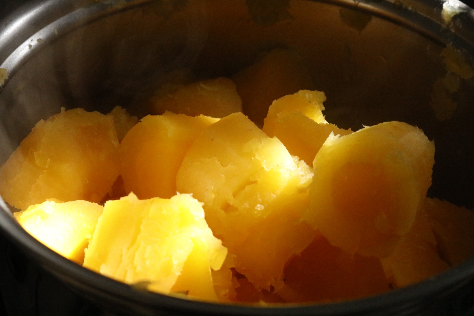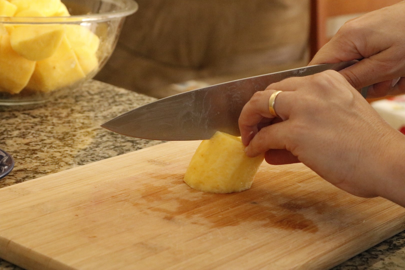 Quando chegou a vez do nhoque, eu já estava cansada. Em pé havia bastante tempo, comecei a sentir dor na lombar. Descasquei as mandioquinhas e sentei um pouco enquanto elas cozinhavam. Até foi o suficiente para recuperar o corpo, mas não a paciência.