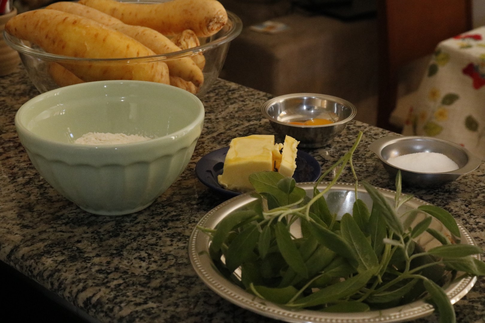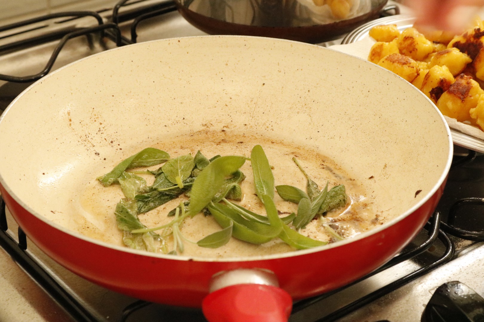 O nhoque de mandioquinha com molho de manteiga e sálvia ficou bem interessante. O meu palpite é que foi devido à manteiga, que era Président, e à sálvia, que era da horta.