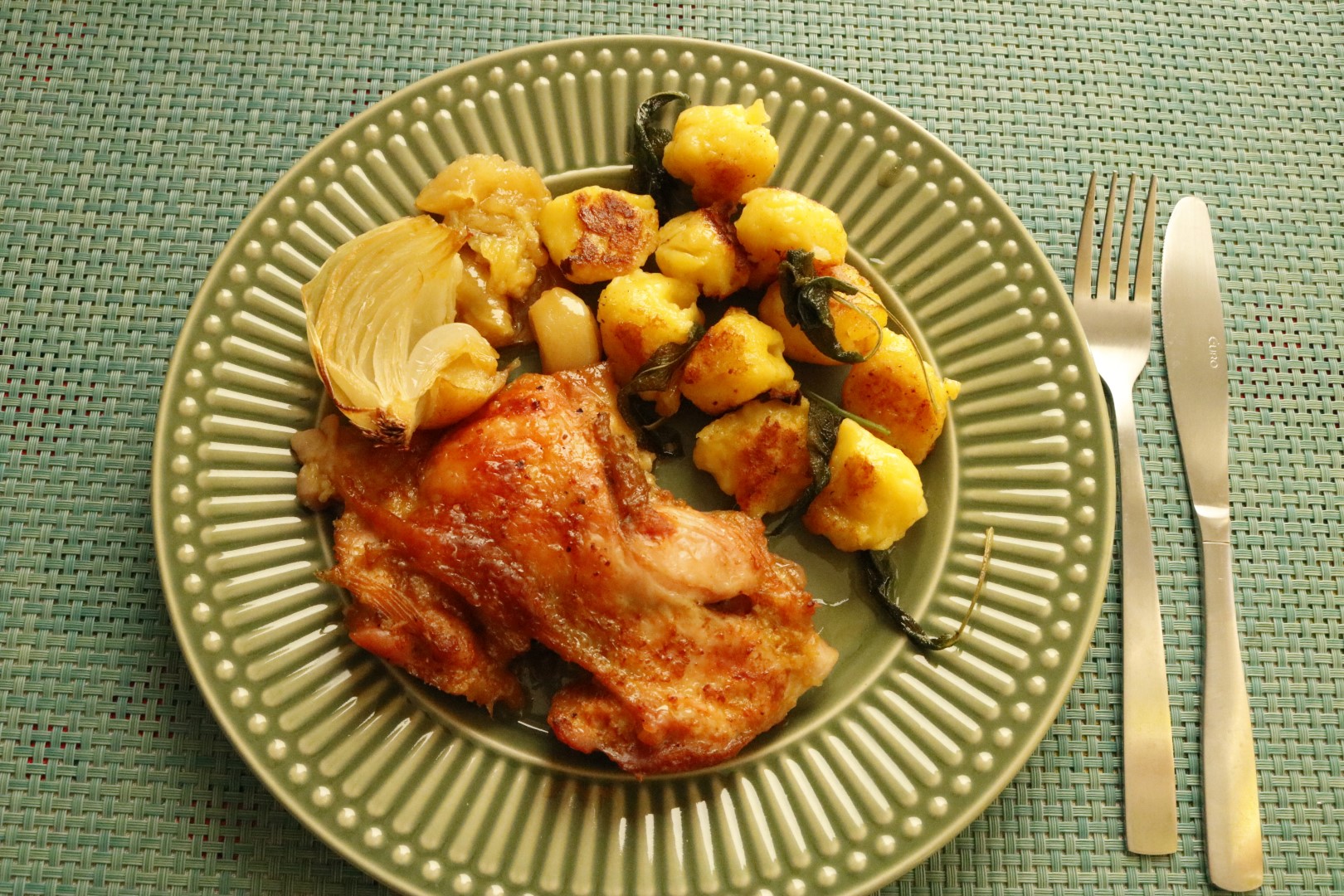 Como o nhoque de mandioquinha é ao molho de manteiga e sálvia, decidi fazer uma proteína para acompanhar. Escolhi uma sobrecoxa agridoce, feita com manteiga de maçã e caldo de laranja. Divina! Tudo receita dela. ❤️ Comecei o preparo pelo frango, que levaria um tempão no forno.